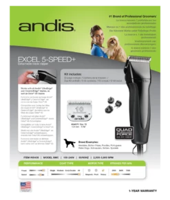 The powerful Andis® Excel 5-Speed Clipper offers the most complete grooming performance ever! Use lower speeds for cooler running and clipping around sensitive areas, and higher speeds for prettier coat finish. 10% faster than the AGC Super 2-Speed. With a 4×4 blade drive and 25% more blade torque, it has the power for your toughest grooming jobs.