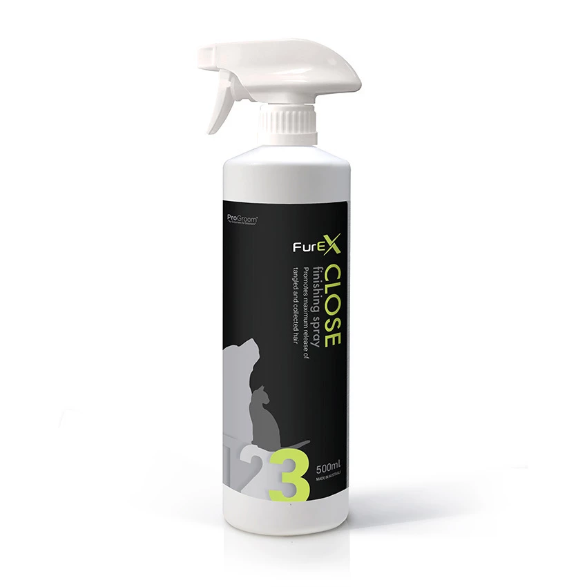 FurEx Close Finishing Spray Step 3 is a mildly acidic, leave-in conditioning formula that will further seal the hair cuticle and promote maximum release of tangled and collected hair within the coat.