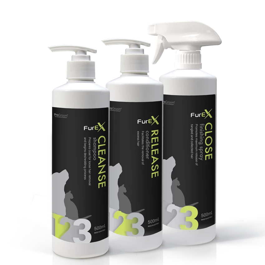 Fur-Ex is an advanced 3-point system from ProGroom, specifically formulated to assist in the removal of collected undercoat of double-coated breeds after the bath.
