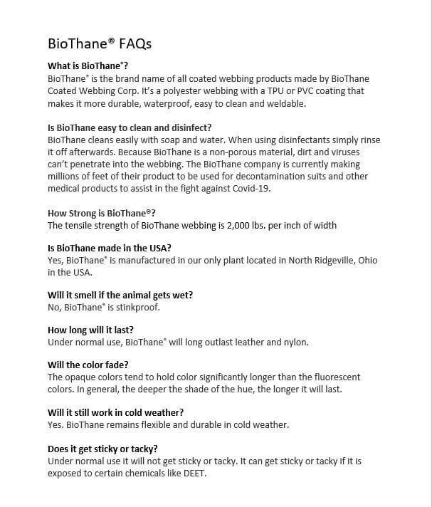 Biothane is a durable, waterproof, and easy to clean product.