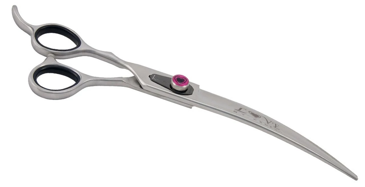 Kenchii’s top performance value grooming shears! Fully forged and hand-honed Japanese alloy steel with custom non-slip micro-serrated semi-convex edge. Love models are made with offset handles for comfort and finished with rustproof satin.