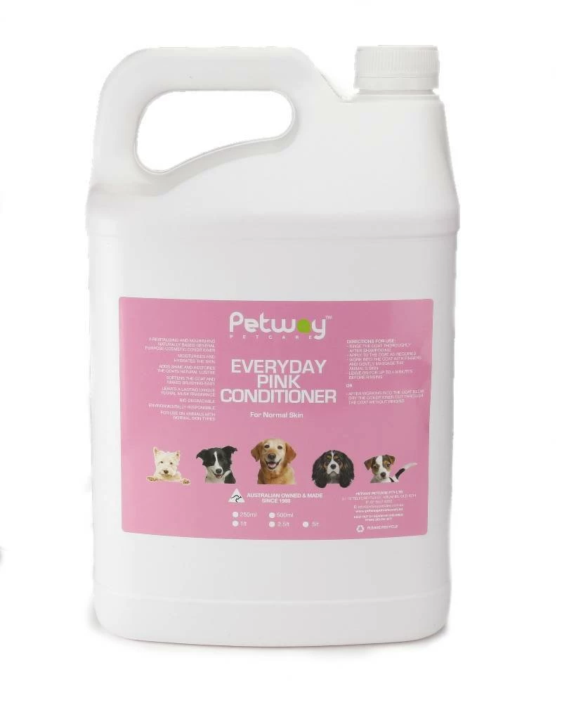 Petway Petcare Everyday Pink Conditioner a revitalizing and nourishing naturally based, general purpose cosmetic conditioner for normal skin types, that adds shine and restores the coats natural lustre, while invigorating the skin. It will soften the coat and make brushing easy. Easily rinsed out or can be blown out through the coat with dryer. Leaves a lasting unique floral spice fragrance that matches our popular Petway Petcare Everyday Pink Shampoo, however, it can be used in conjunction with all Petway Petcare Shampoos.