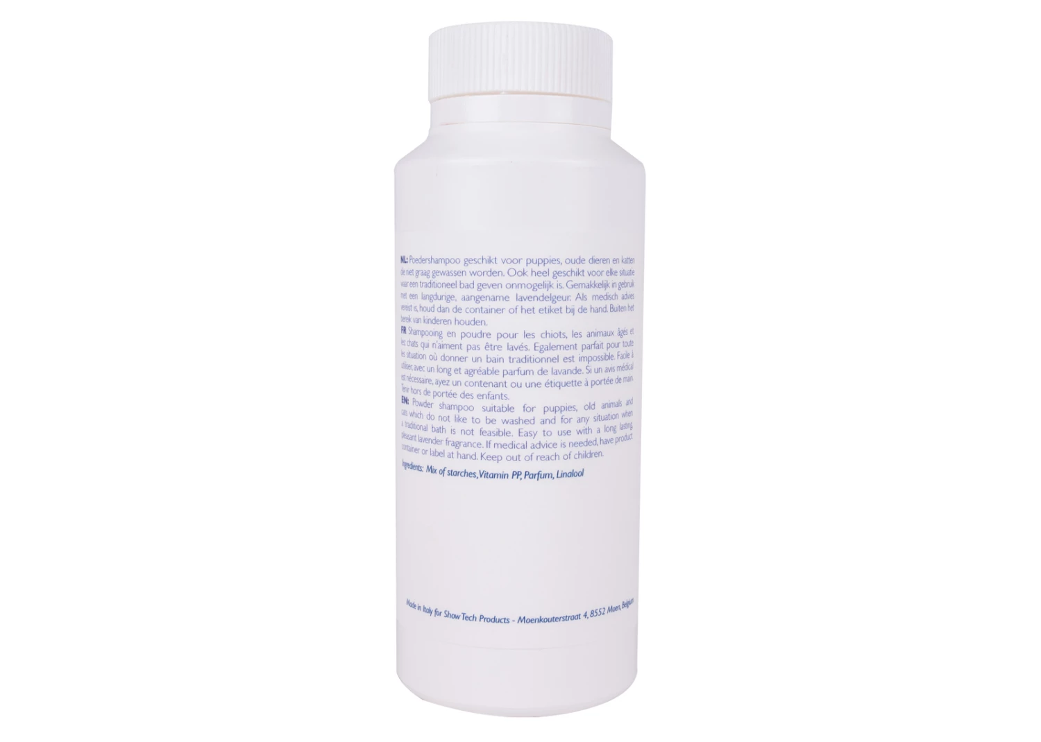 - Powder shampoo suitable for puppies, old animals and cats which do not like to be washed and for any situation when a traditional bath is not feasible.