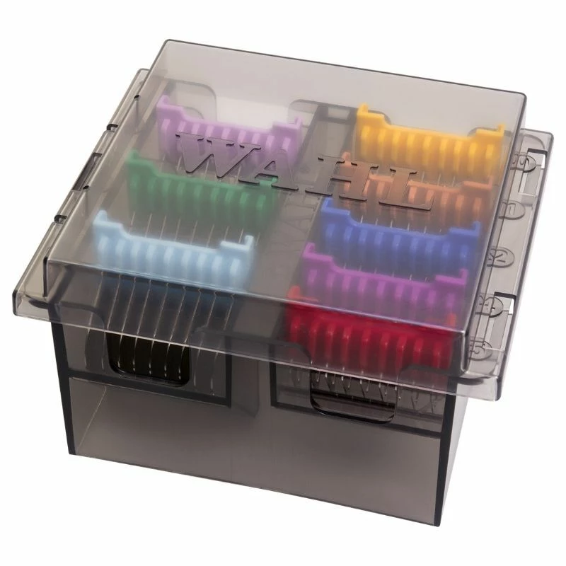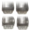 This set of 8 Stainless Steel comb guide attachments were designed for both the home groomer or the professional groomer. They attach securely to the blade eliminating the worry of combs coming off, causing gouges. The colour coding works as a quick reference and the convenient storage stand keeps them neat and easily accessible.